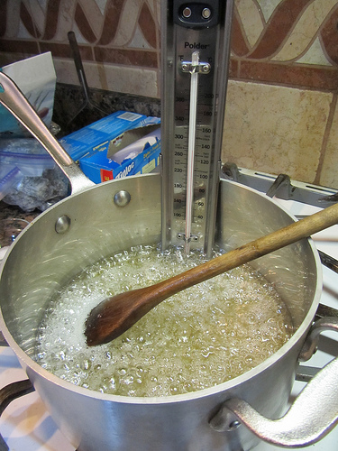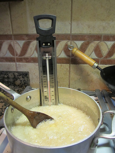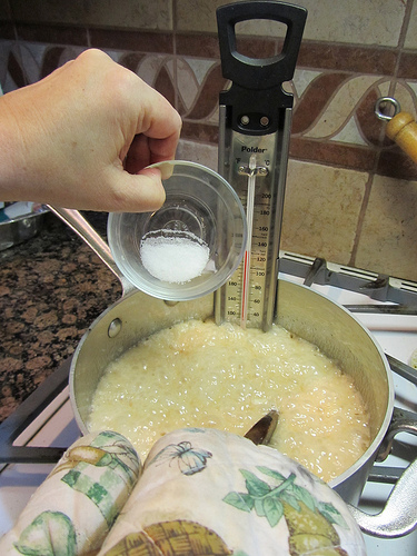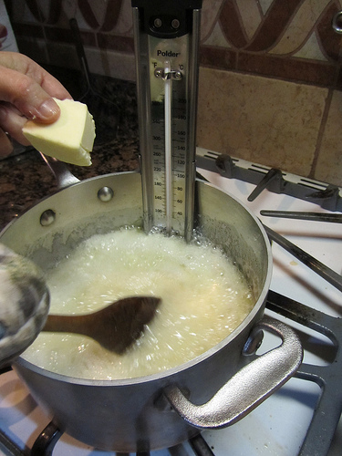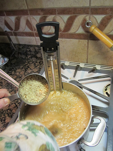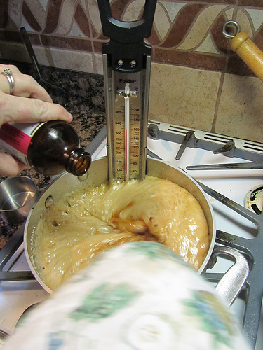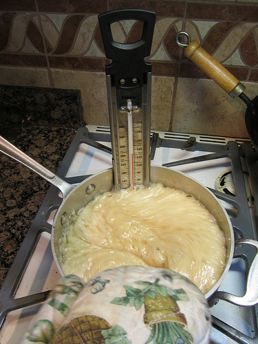 The key is a good candy thermometer. I recommend the Polder Candy/Jelly/Deepfry Paddle Thermometer. I got mine at the King Arthur Flour Company. This themometer has a clear read and doesn’t steam up like those hollow glass one. The glass thermometer is protected by a stainless steel metal paddle with a study clip for a heavy, straight sided pan.