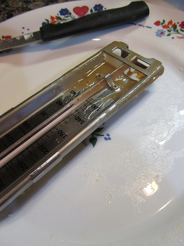 Unclip and drain candy from thermometer and leave it on a plate to keep hot molten candy from burning yourself or others. This candy is lost to the ages- don’t try to sample it now. You will burn your mouth.