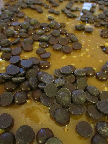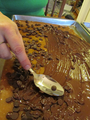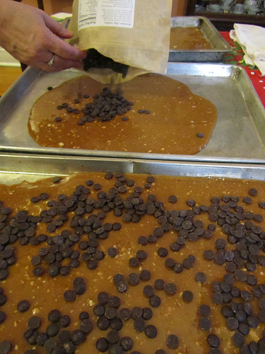 To coat the candy with chocolate on one side, sprinkle chopped chocolate chips on the still hot toffee to melt it.
