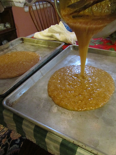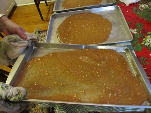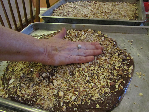 Tilt the pans and spread the toffee on the edges with the wood spoon to the thickness you like. While the candy is hot you can press in marks with a buttered knife to break it into more even pieces.