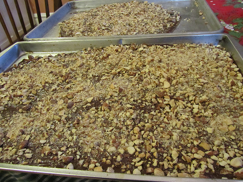 Let it cool, even overnight. Then break into pieces. I like thinner toffee with lots of chocolate and nuts, but you can make much thicker toffee too- just use fewer pans or don’t spread it much after pouring.