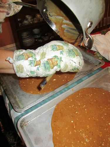 Scrape the last out but you won’t get all of it. Don’t break your heart over this, you’ve got to move quickly to spread out the toffee in the pans!
