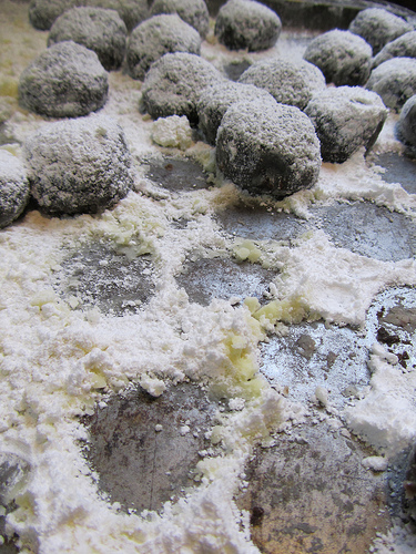 Prepare the pans. I use three cookie tins per batch. I also unwrap the butter, put it on a plate and cut it up and grease the pans lightly with the butter wrappers.