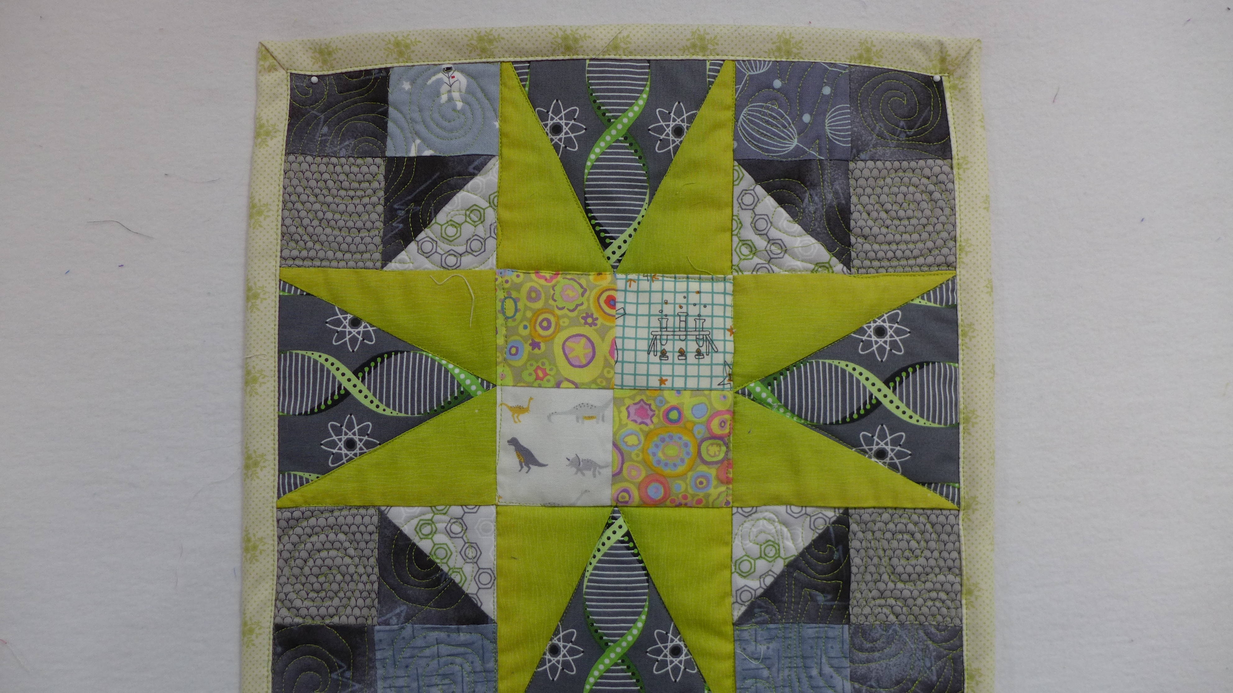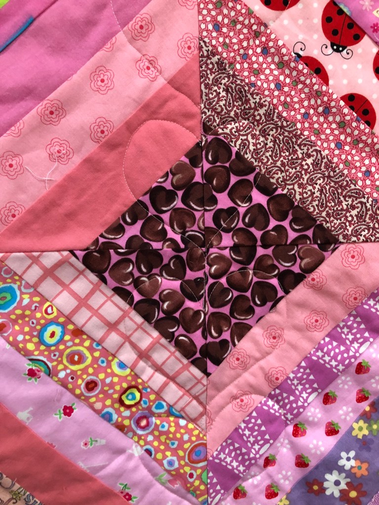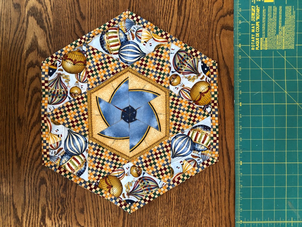 I love the Project Quilting flexibility though. I decided to pick out one block and play with adding some additional triangles and diamonds with scraps from the same balloon fabric line. In the end, I made a 17″ complex hexagon quilted piece with one of the One block Wonders in the center. I made use of the Y-seam method I learned in a Minnesota Quilters online retreat in 2021.